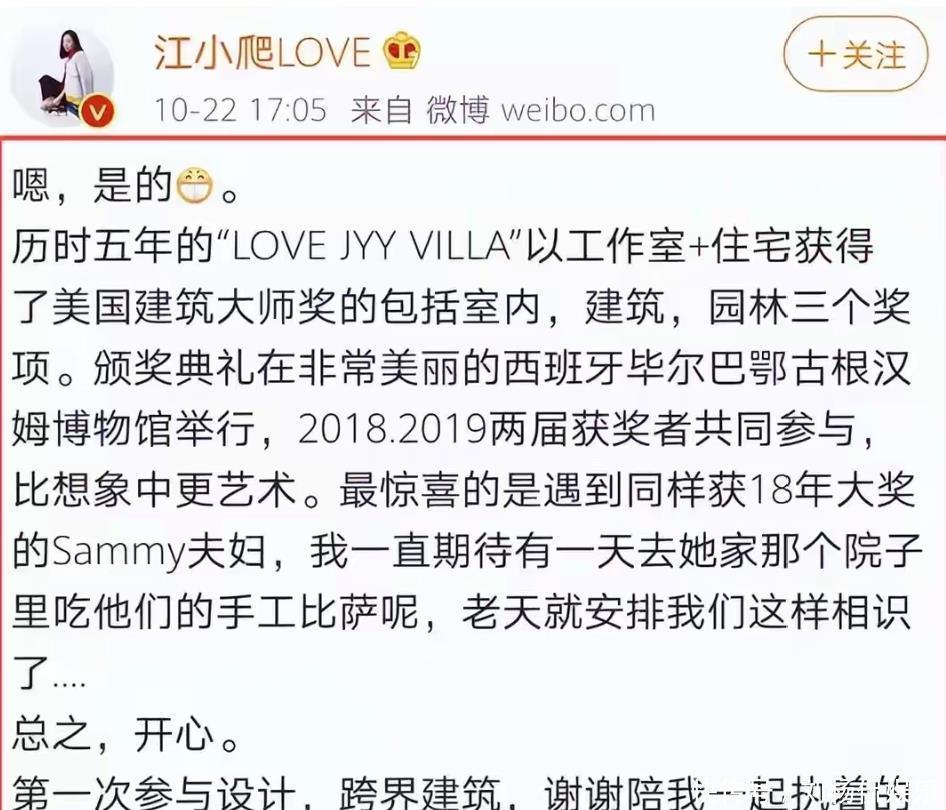02 人生的转折点2019年,江一燕在个人社交平台分享获得"美国建筑师大奖"的消息,随后引发讨论。有网友指出她在获奖项目中担任的是业主身份,这一事件让她陷入舆论漩涡。